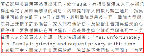 吴耀汉妻子则用短信回复记者,亲证死讯,"Yes, unfortunately it is. Family is grieving and request privacy at this time.(死亡是不幸的事实,家人对此悲痛欲绝,希望给予我们私人空间)"