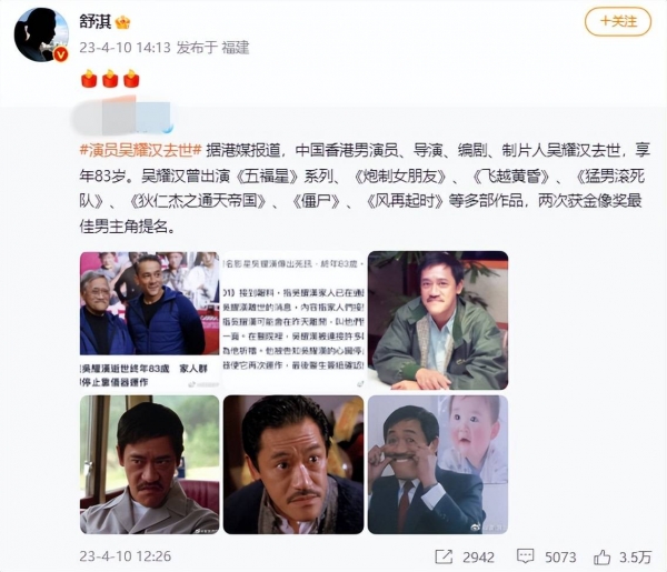 舒淇转发相关新闻,不舍老前辈: