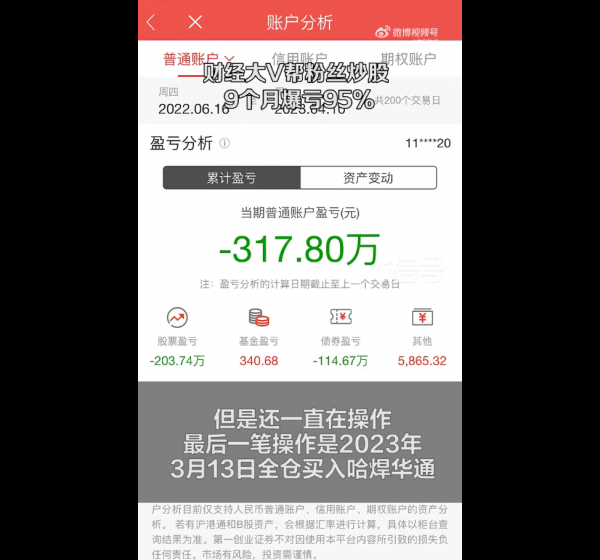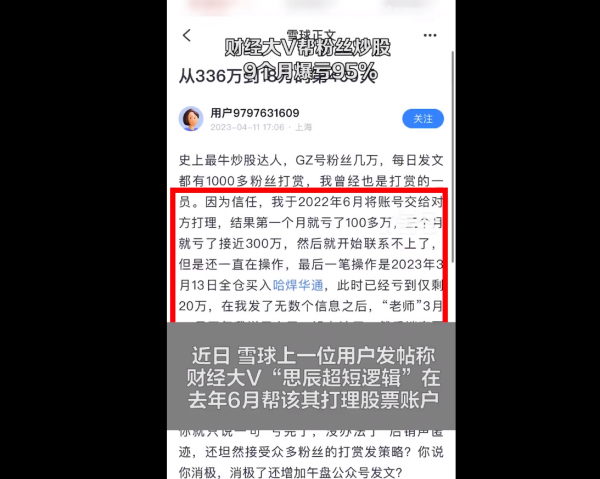 近日,雪球上一位用户发帖称,财经大V"思辰超短逻辑"在去年6月帮该用户打理股票账户,第一个月就亏了100多万,三个月亏了近300万之后,就开始联系不上。