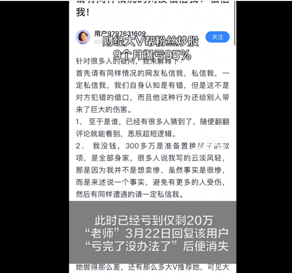 (原标题:财经大V帮粉丝炒股爆亏95%后跑路 回复"亏完了没办法"后消失)