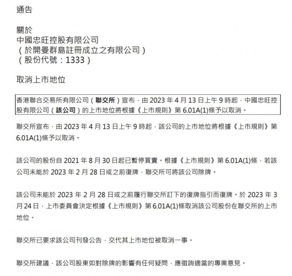6日晚间,中国忠旺在港交所发布公告称,香港联交所宣布,由2023年4月13日上午9时起,该公司的上市地位将条予以取消。