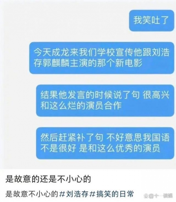 据了解,当时成龙、刘浩存、郭麒麟等人来到某高校宣传《龙马精神》,轮到他发言时,却说了以上的话。网友直言,他这是故意的还是不小心呢?
