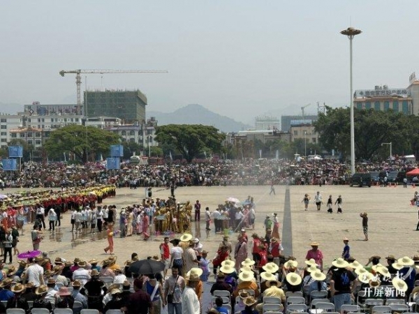 在泼水节开幕前,芒市组织了一场非物质文化遗产展演,由傣族、德昂族、景颇族等各民族组成的方阵队伍在街上进行巡游,展示民族歌舞和地方特产。