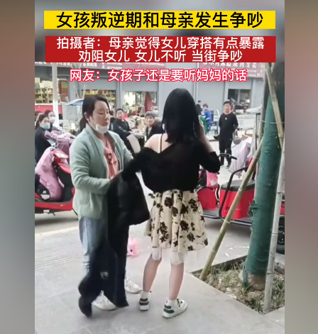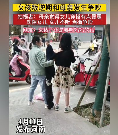 4月11日,河南某地的街头,一名母亲拉扯着女儿不让她走,非要脱掉女儿的衣服,换上自己拿来的外套,母女俩的争执引来了路人围观。