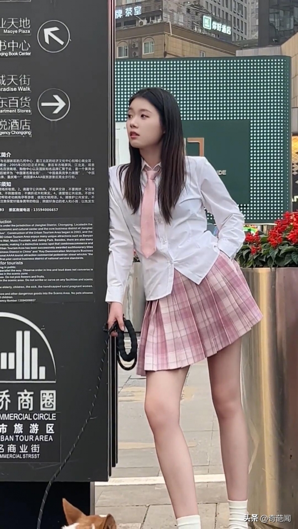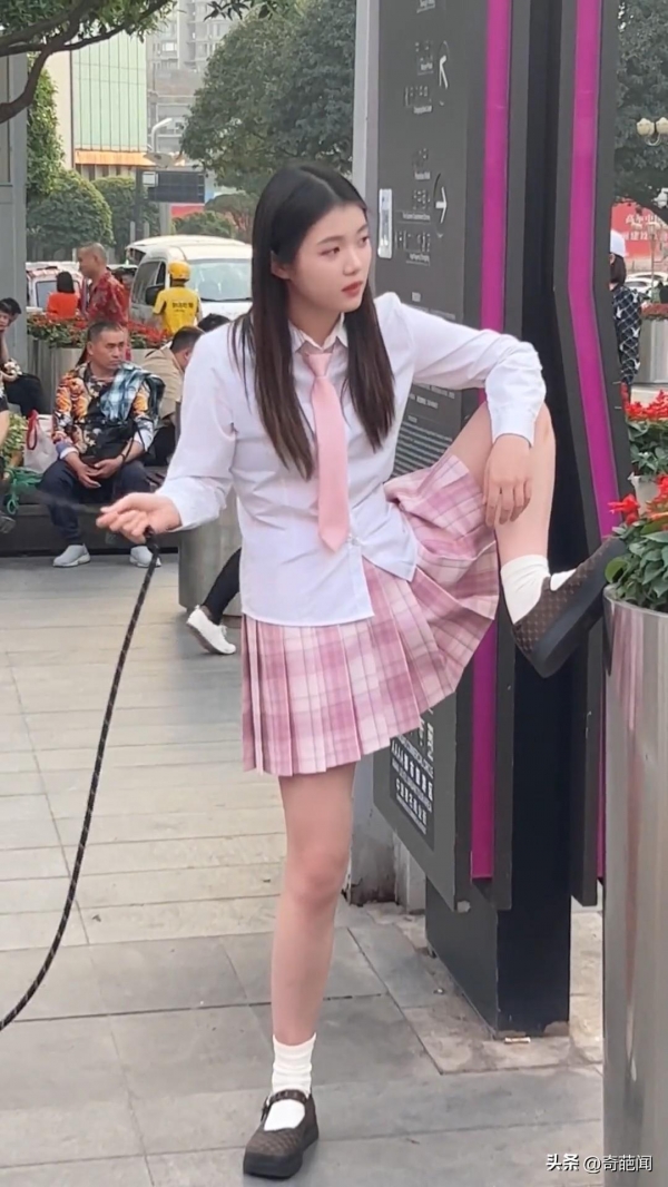 视频画面中这位女孩上身穿着白色衬衫打着粉色领带,下身搭配着粉色格子裙,露出白皙的长大腿,不仅凸显出窈窕的身材,而且浑身还散发出了清纯可爱的气息,可之后女子的举动则是令画风突变。