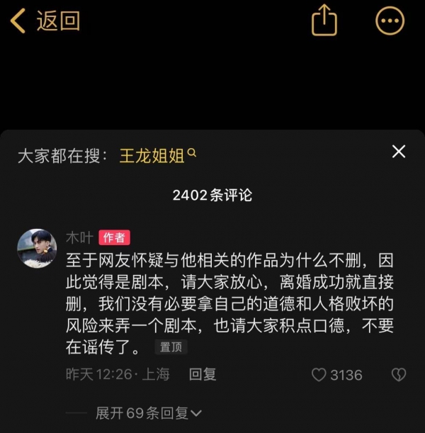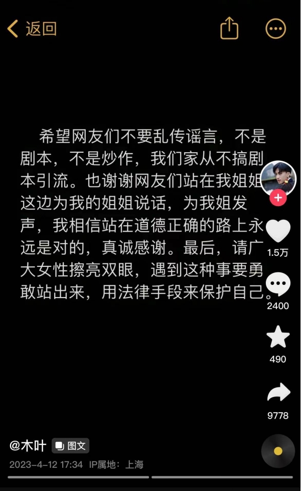 关于网友质疑这是剧本炒作的相关争议,"木叶"这件事不是剧本不是炒作,相关作品离婚成功后就删。
