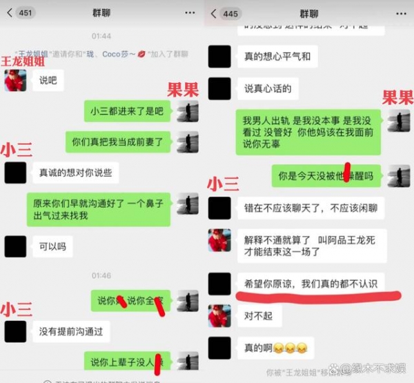 小三称:"希望你原谅,我们真的都不认识",并再三向果果道歉,可惜果果并不买账,之后被王龙姐姐踢出了群聊!