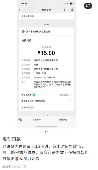 近日,深圳一市民在乘坐地铁时,因在站内停留4小时除车费外还被收取了15元的"超时费",消息一度冲上热搜。