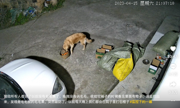 4月15日,湖北宜昌。网红博主下架自家金毛狗"亲嘴"采摘的"毛毛果",但狗狗不知情依旧卖力装箱。