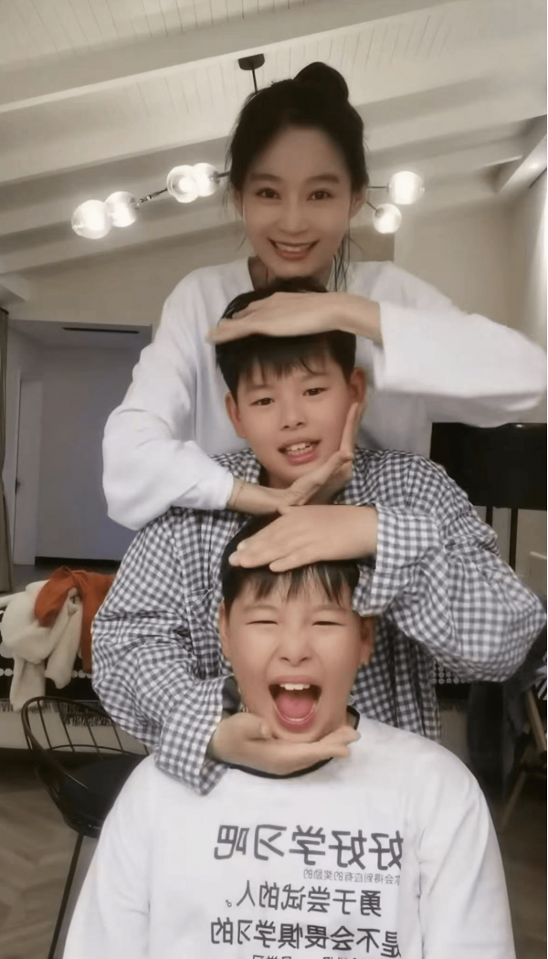 只见母子三人穿着睡衣,对着镜头面露微笑,做出搞怪的表情,画面温馨且幸福,尤其是已经39岁的王媛可,保养得当的她依旧身材纤细、肤白貌美,少女感十足。