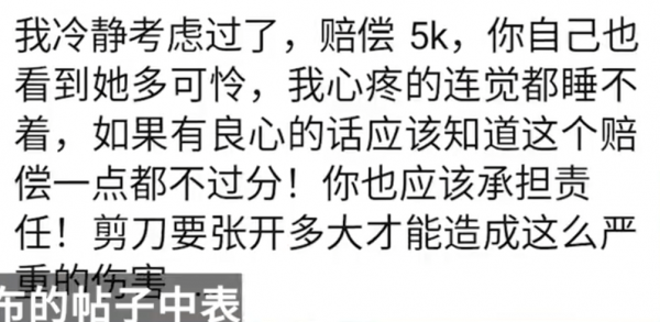 该女子在文中表示,要求赔偿五千元,还在和店主联系的记录中提到,"不用力肯定剪不断舌头。"