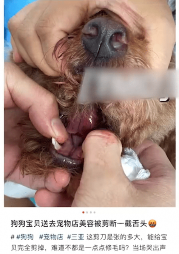 4月17日,据九派新闻视频报道,4月15日,海南三亚一女子发文称,某宠物店给自己的狗做美容时,将狗的舌头剪断了一截,引起广泛关注。