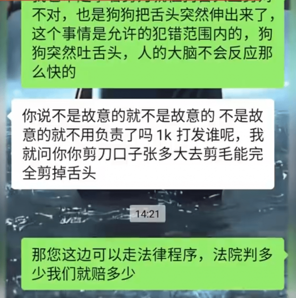 17日,该宠物店店长回应称,并非故意剪断舌头,美容师操作时,狗突然伸出舌头,导致此事发生。"正常的一个操作范围内,左手捏着嘴巴,狗把舌头伸了出来,碰到了剪刀,剪掉了一小节,不到1厘米,0.5厘米吧。"