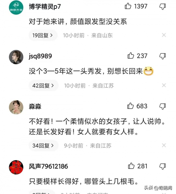有网友评论说,寸头看着还行,但女人还是要应该有女人的样子,符合大众认知才美。