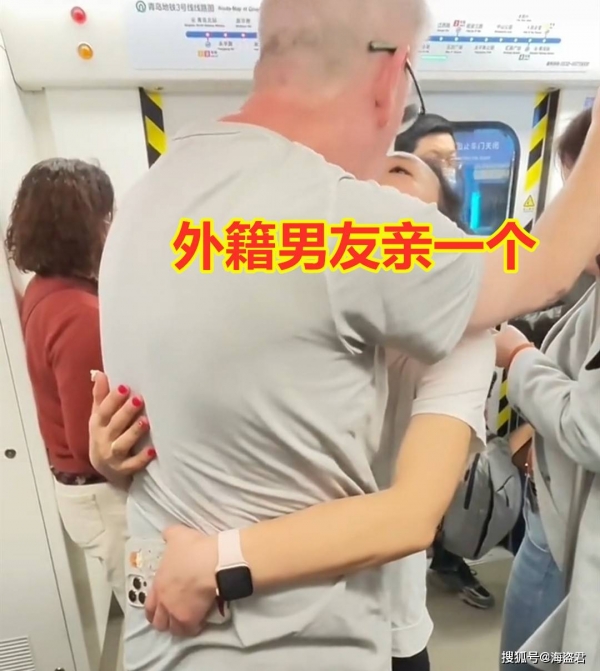 4月16日,山东青岛,一名女子地铁上情难自禁,抱着外籍男友一直仰着头索吻,男友一一满足,丝毫不在意其他乘客的目光。