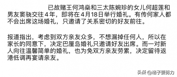 港媒有传闻"考虑的到双方家庭亲友众多,去婚礼现场又是舟车劳顿,不想漏掉任何人,在双方父母的同意下,巴厘岛婚礼只邀请好友出席,而何家人不会出席。"
