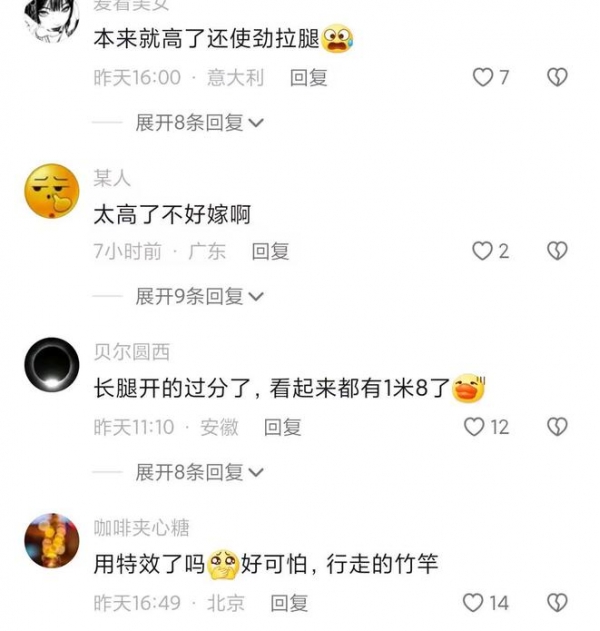 有网友评论说,所以不一定高就好看,我觉得165-172是理想身高,女生太高要看比例。