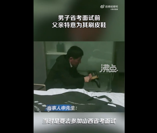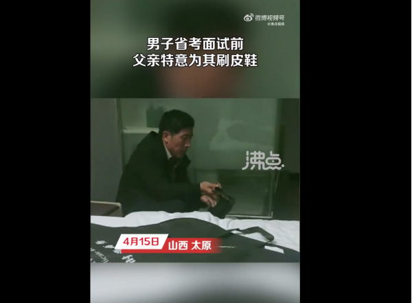 4月15日,山西太原。网友发视频称当了一辈子工人的父亲没法指导自己省考面试,只能默默给自己擦皮鞋,父亲也想让自己光彩一次。