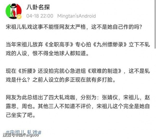 不少网友都觉得宋祖儿不尊重演员这个职业,还有网友觉得宋祖儿这样拍戏的态度,也相当不尊重观众,甚至有网友觉得宋祖儿是自己啪啪打自己脸。