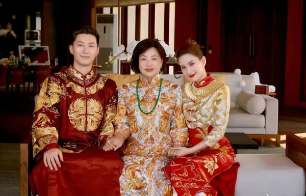 与之前的网传消息不同,三太太陈婉珍并未缺席女儿的婚礼。陈婉珍身穿传统龙凤褂,佩戴翡翠项链和手镯,显得雍容华贵。