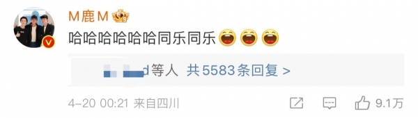 几分钟后,鹿晗火速回复,还用欢快地语气表示"同乐同乐"。