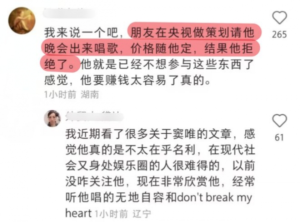 还有网友们爆料,自己的朋友就是在央视工作做策划的,之前请过窦唯演出,并且开出高价,但是都被都为拒绝了。可见窦唯真的是不会为五斗米而折腰的,有自己的追求和梦想,并且不会轻易地改变。