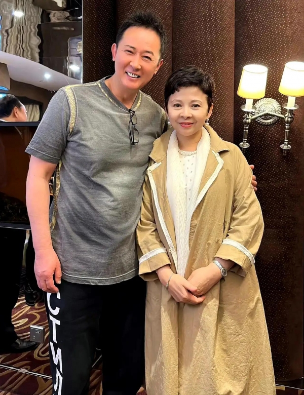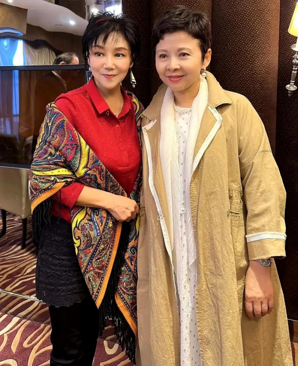 董文华还和小师妹苏红单独合影,董文华外面穿的是黄色薄外套,搭配里面的白裙子白色丝巾,外套领口袖口也有白色镶边,和白裙子很搭。苏红上身穿红上衣,下身搭配黑色超短裙黑色裤子,外面还有一件彩色丝巾。苏红是64年出生,今年58岁,比董文华小3岁,董文华神态自如,苏红笑不露齿,二人亲密合影说明她们私下里友情也不错。