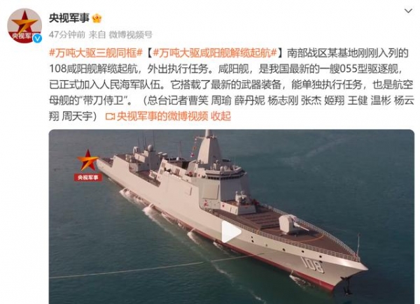 央视军事称,南部战区某基地刚刚入列的108咸阳舰解缆起航,外出执行任务,这是我国最新的一艘055型驱逐舰,已正式加入人民海军队伍。