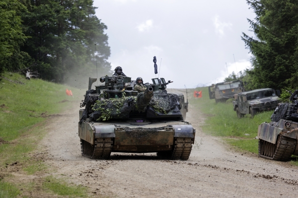 一辆美国陆军M1A1"艾布拉姆斯"坦克在德国霍恩菲尔斯的霍恩菲尔斯训练区进行训练演习。图自CNN