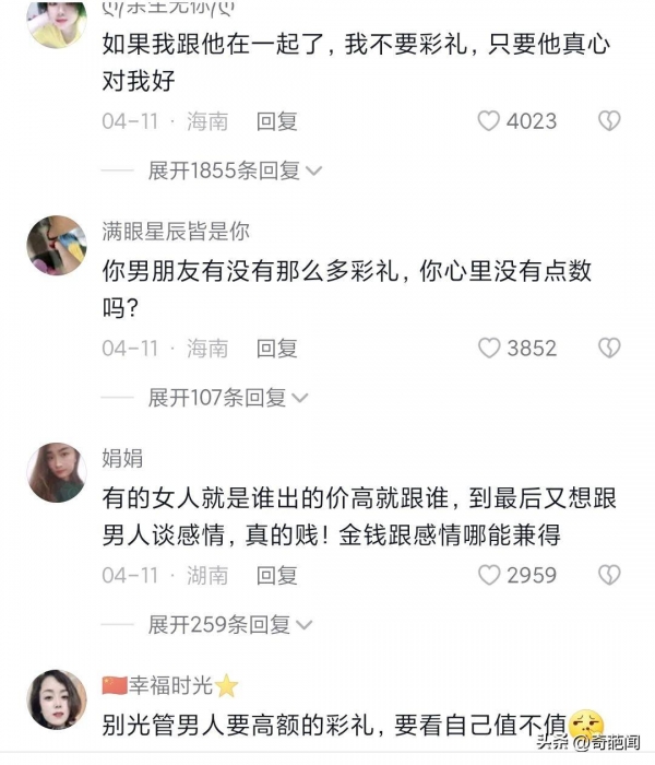 还有网友评论说,自古彩礼都是男方自愿给的,不是女方要的,男方给女方彩礼是为了表达男方对女方的重视,要量力而行,不是女方为了表达自己的重要性而去要高彩礼,