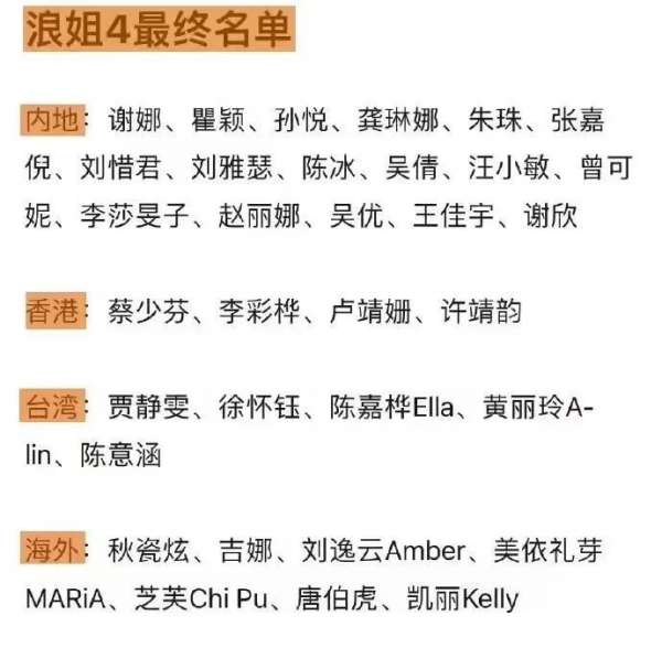 经过各种猜测和爆料,《浪姐4》的最终名单终于尘埃落定。据悉,本次共有33位姐姐,包括孙悦、龚琳娜、秋瓷炫、李彩桦、朱珠、蔡少芬、吴倩等等。