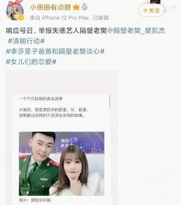 没过多久,一个名叫"小田田有点甜"的网友,实名举报隔壁老樊。据悉,她是他哥哥的前妻,也就是他的前嫂子。