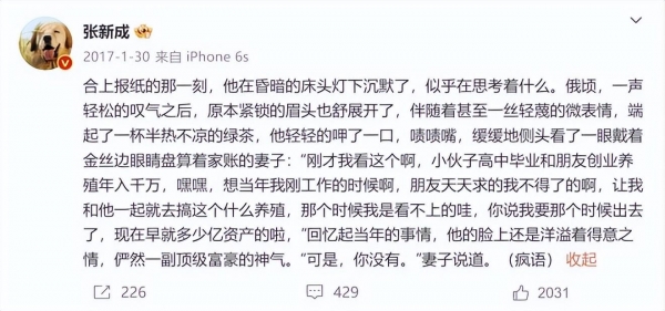 合上报纸的那一刻,他在昏黄的床头灯下沉默了,似乎在思考着什么。俄顷,一声轻松的叹气之后,原本紧锁的眉头也舒展开了,伴随着甚至一丝轻蔑的微表情,端起了一杯半热不凉的绿茶,他轻轻地呷了一口,啧啧嘴,缓缓地侧头看了一眼戴着金丝边眼镜,盘算着家账的妻子:"刚才我看这个啊,小伙子高中毕业和朋友创业养殖年入千万,嘿嘿,想当年我刚工作的时候啊,朋友天天求得我不得了的啊,让我和他一起就去搞这个什么养殖,那个时候我是看不上的哇,你说我要那个时候出去了,现在早就多少亿资产的啦?"回忆起当年的事情,他的脸上还是洋溢着得意之情,俨然一副顶级富豪的神气。"