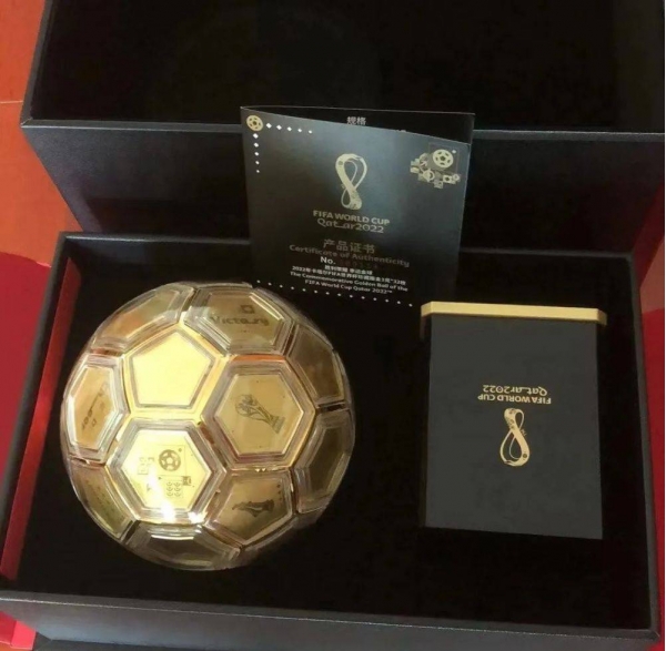 薛先生购买的这款金球,名为"2022年卡塔尔FIFA世界杯至尊金球",官方介绍"它由32枚官方授权纪念章拼接而成,采用创新炫彩金工艺,高亮黑UV钢琴烤漆基座,稳稳托起金球球体,黑色专属包装高端大气。"属于限量定制款,底座是有梅西的亲笔签名,特许首发价为99800元。