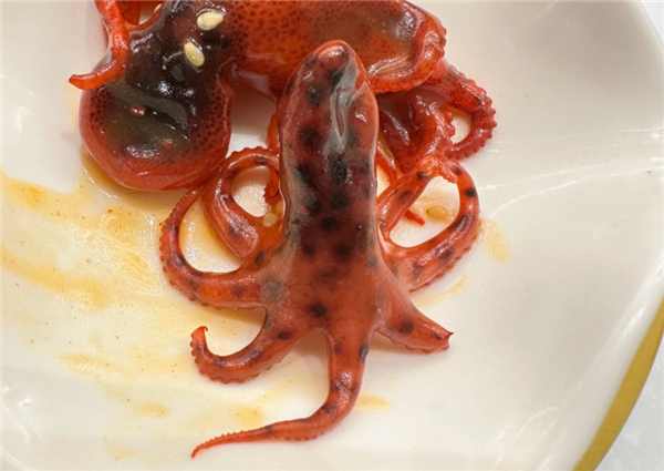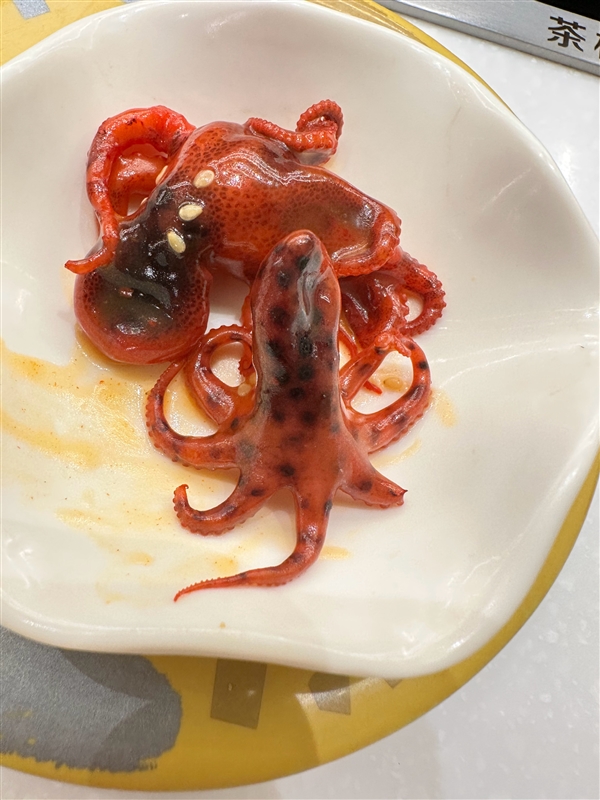 日前,有网友在吃回转寿司时,发现端上来的餐盘里的有一只章鱼不大一样,通身遍布了黑色的斑点,网友称凑近看还能看到小黑点上面有圆环,出于警惕,她发布了微博求助网友,并艾特了博物杂志。