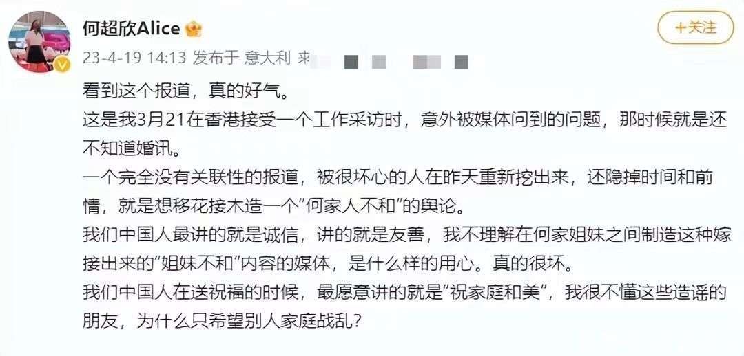 令何超欣气愤地发文回应,并质问造谣地人,称不懂为什么希望别人家庭战乱。