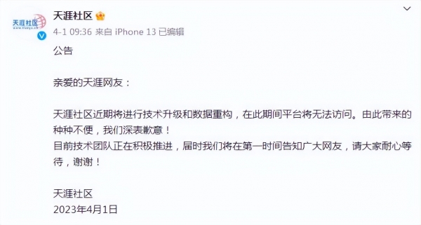 此前,天涯社区官方微博曾于4月1日发布公告称,近期将进行技术升级和数据重构,在此期间平台将无法访问,"请大家耐心等待"。