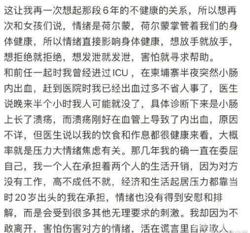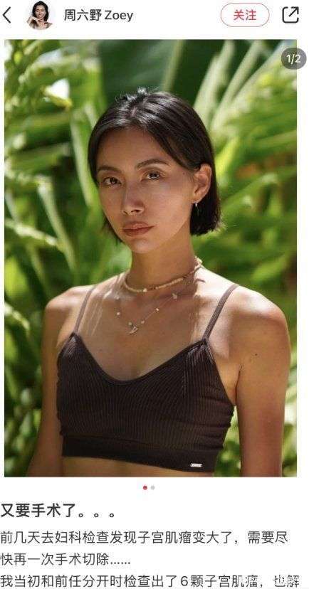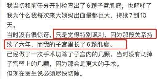 手术的原因是她妇科检查发现子宫肌瘤变大,需要在一次手术切除,而之所以患上子宫肌瘤周六野自述,是因为和前任在一起六年,不仅如此,这段不健康的关系还差点要了她的命。
