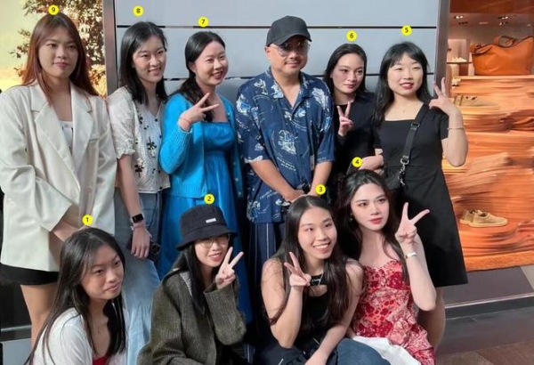 仔细看徐峥两颊肉嘟嘟的,双下巴也十分明显,胡子还有点花白。他戴着墨镜和帽子看上去十分低调,但还是被热情的女粉丝认出,9位女粉丝将其团团围住,拍下了这张合影。