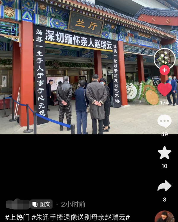 朱迅手捧遗像送别亡母,神情悲痛一言不发,其晚年住养老院成遗憾