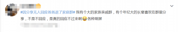 还有人分享自己的经历:"我有个大的家族亲戚群,有个年纪大的长辈喜欢在群里分享,不是不回应,是真的回应不过来啊"