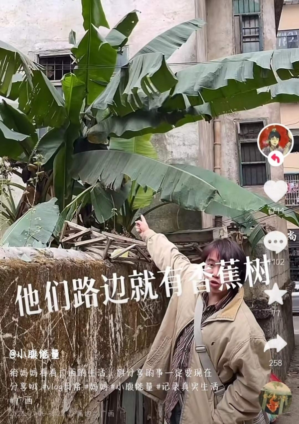 一系列"带上妈妈云旅行"视频发布后,小腹同学获得了意想不到的关注度,短期内迅速涨粉,点赞量和评论区互动数也大量增加。不少当地网友还给他分享广西旅行攻略和当地美照。