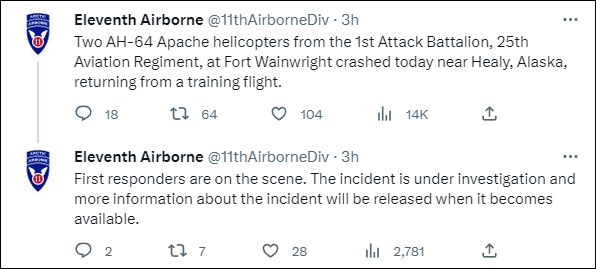 美军第11空降师的官方推特账号发文称,"今天,两架部署在温赖特堡的AH-64'阿帕奇'直升机在飞行训练的返回途中坠毁。急救人员已经到达现场。该事件正在调查之中,更多相关信息将在获得后公布。"