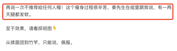 不过伊能静多次强调称,不推荐给任何人,因为瘦身过程中,秦昊坦言有一两天腿都发软。