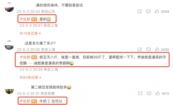 网友表示真的很伤身体,建议大家不要轻易尝试,伊能静回应说"是的",同时还附上了泪流满面的表情包,不难看出她对秦昊真的很心疼。