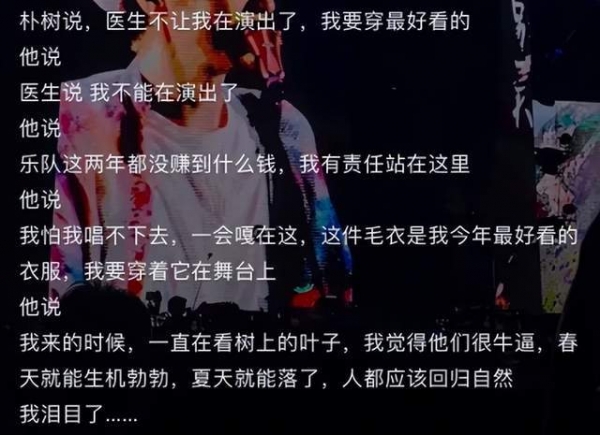 其中,朴树在唱最后一首歌的时候,突然情绪低迷起来,声音开始变得嘶哑,说自己病情比以前要更加严重了,医生朋友警告他不要演出,但由于这两年多乐队没有赚到钱,所以他必须得担起责任,坚持站在这个舞台上。