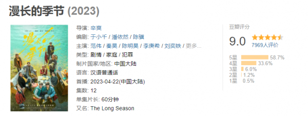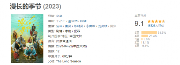 最先上线的电视剧《漫长的季节》,拿下了豆瓣9分的成绩,目前又涨了一分变成9.1分,成功引悬疑迷入坑。