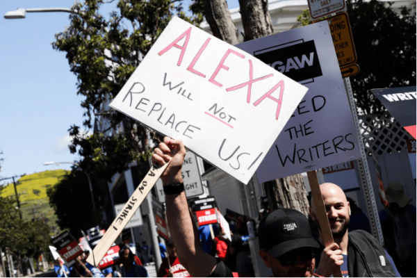 流媒体都能对编剧的创收造成如此大的影响,更具颠覆性AI令他们如此焦虑就不难理解了。电影公司若训练AI进行剧本创作,编剧断然无法接受,因为那将是用他们的作品,断他们的生计。"AI让企业变得贪婪。"罢工者表示。"是我们编剧让电影公司赚钱,而电影公司反咬我们一口,把我们逼上街头,用这种方式捍卫权利。"有人直接喊出了"建议给我们付钱"的口号。还有人充分发挥了幽默的特长,标语牌上书:"要么你们付钱,要么我们剧透"。