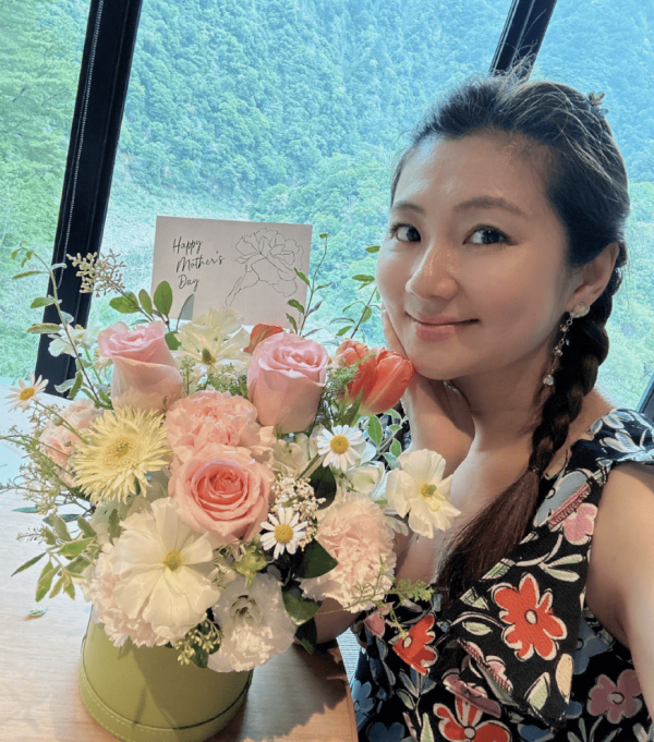 Selina分享了美美的自拍,她收到了母亲节鲜花,但并没有说明花是谁送的,卡片上写着祝福"happy mother's day",估计是酒店给她送来的惊喜。