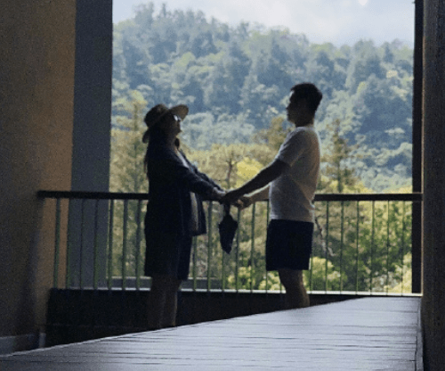 有一张小图中,Selina和男友小徐手牵着手,四目相对,小徐的肚子都快和Selina一样大了。